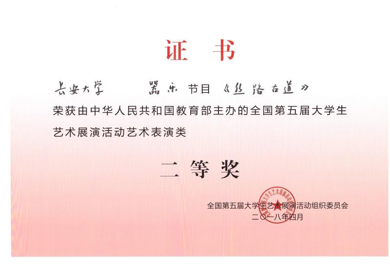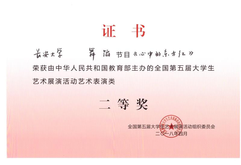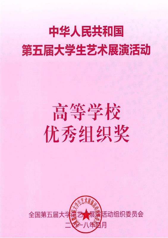 2018年4月16日至21日,由教育部、上海市人民政府主办的全国第五届大学生艺术展演现场展演活动在上海举办。教育部党组书记、部长陈宝生,上海市委副书记、市长应勇出席活动。来自全国400多所高校的8000多名师生聚集在上海,共同见证各地高校的艺术教育成果。我校共获得一等奖1项,二等奖2项,三等奖1项。