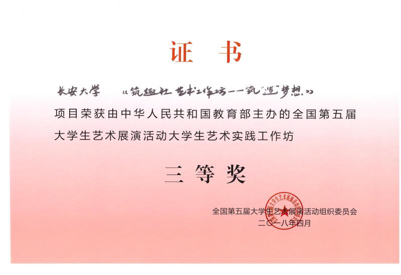 我校报送的由机械学院学生张劭耕、刘杨芳创作的作品《任务型胶囊》荣获设计类一等奖;原创管乐作品《丝路古道》荣获器乐类二等奖;原创舞蹈作品《心中的东方红》荣获舞蹈类二等奖;大学生艺术实践工作坊作品《筑趣社——筑“造”梦想》荣获艺术工作坊艺术与生活类三等奖。我校文传学院教师丁静、张艺凡,信息学院教师陈晏,地测学院教师潘迎,机械学院教师乔涵,建筑学院教师刘鹏、张磊,校团委大学生艺术团指导教师张红、王斯琪荣获“优秀指导教师奖”;我校荣获“高校优秀组织奖”。