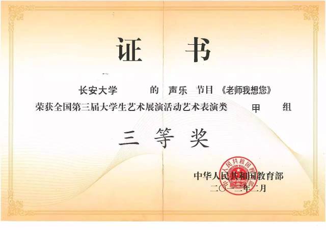 在陕西省第四届大学生艺术展演活动中,《小白菜》获得声乐(甲组)二等奖。